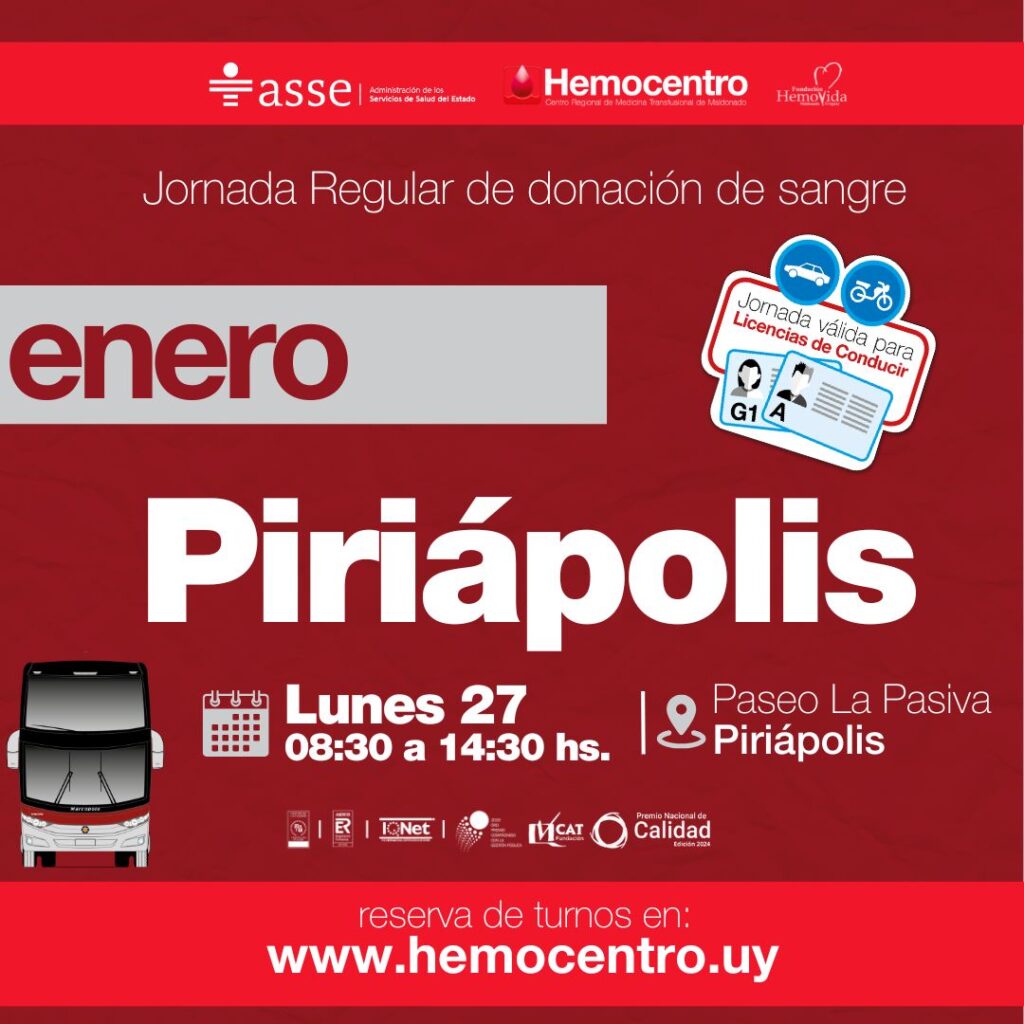El Hemobus estará disponible en el Paseo La Pasiva el lunes 27 de enero, de 8:30 a 14:30, como parte de la campaña del Centro Regional de Medicina Transfusional de Maldonado. Se invita a la población a participar en esta jornada de donación de sangre, recordando la importancia de esta acción solidaria.